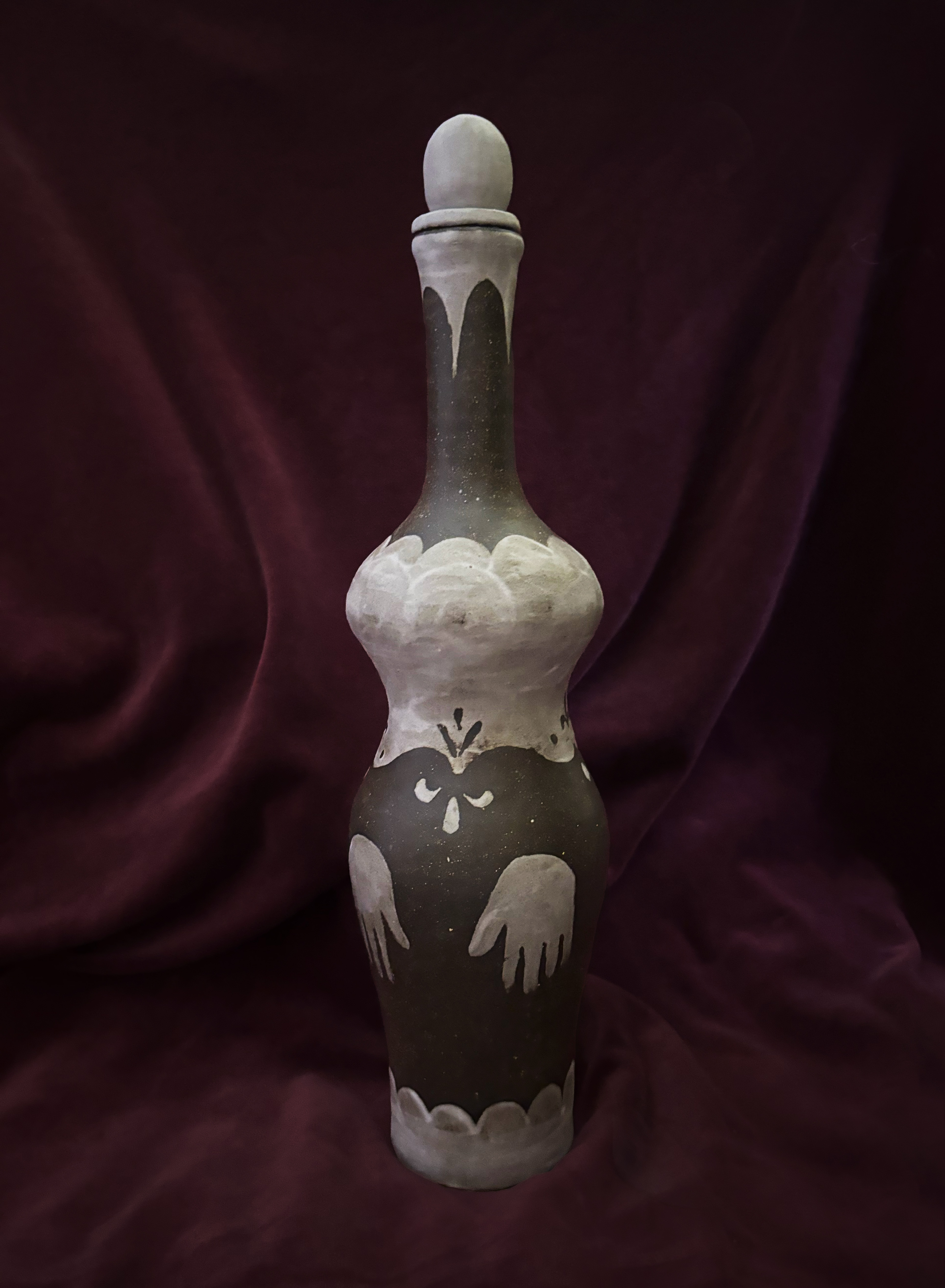 Mid-Fire Ceramics, GlazeA tall bottle left mostly bare with white matte glaze creating a decorative element. It has elements of a scalloped neckline over the top curve and ending in a floral element over the waist. On the lower curve, there are hands. It’s suggestive on how others have left an imprint on the one embodying the bottle’s womanhood.