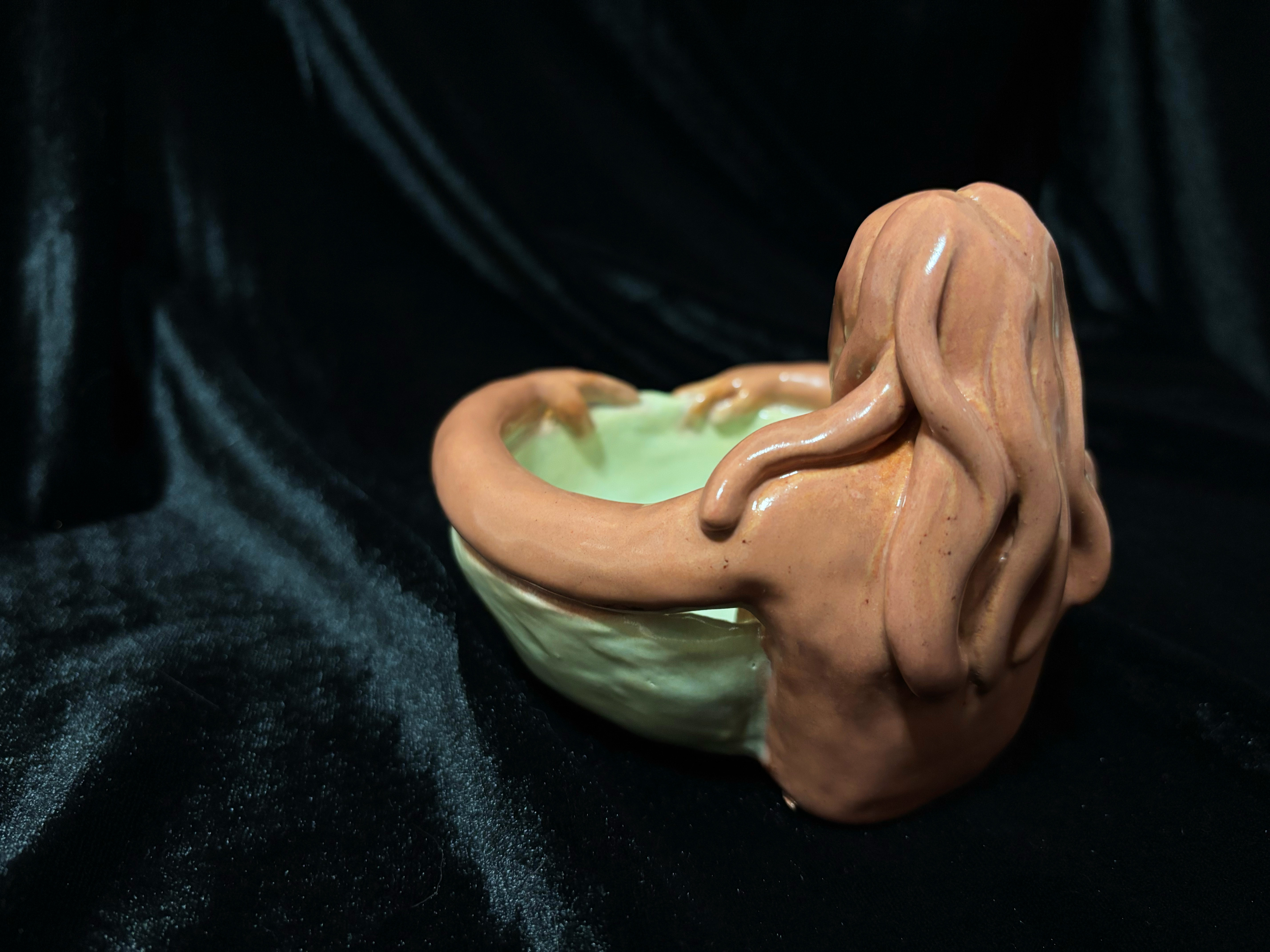 Low Fire CeramicsIn The Wailing Pool, a female figure looms over a bowl. She is statuesque, her hands wrapped tightly around the bowl. Her breasts hang over the rim, shielding the contents from spilling. Her mouth is held open in a silent scream, her hair slick and heavy, as though soaked.